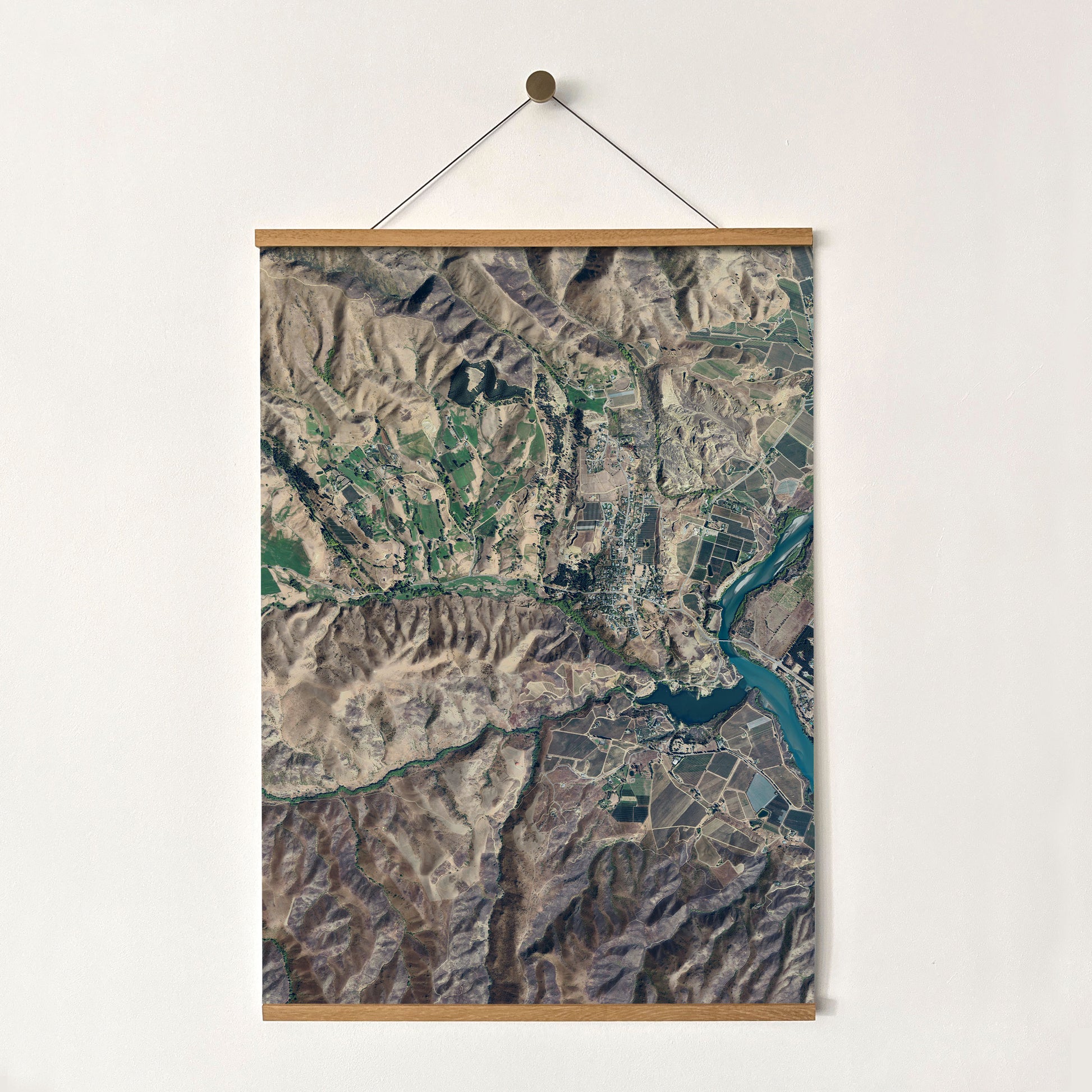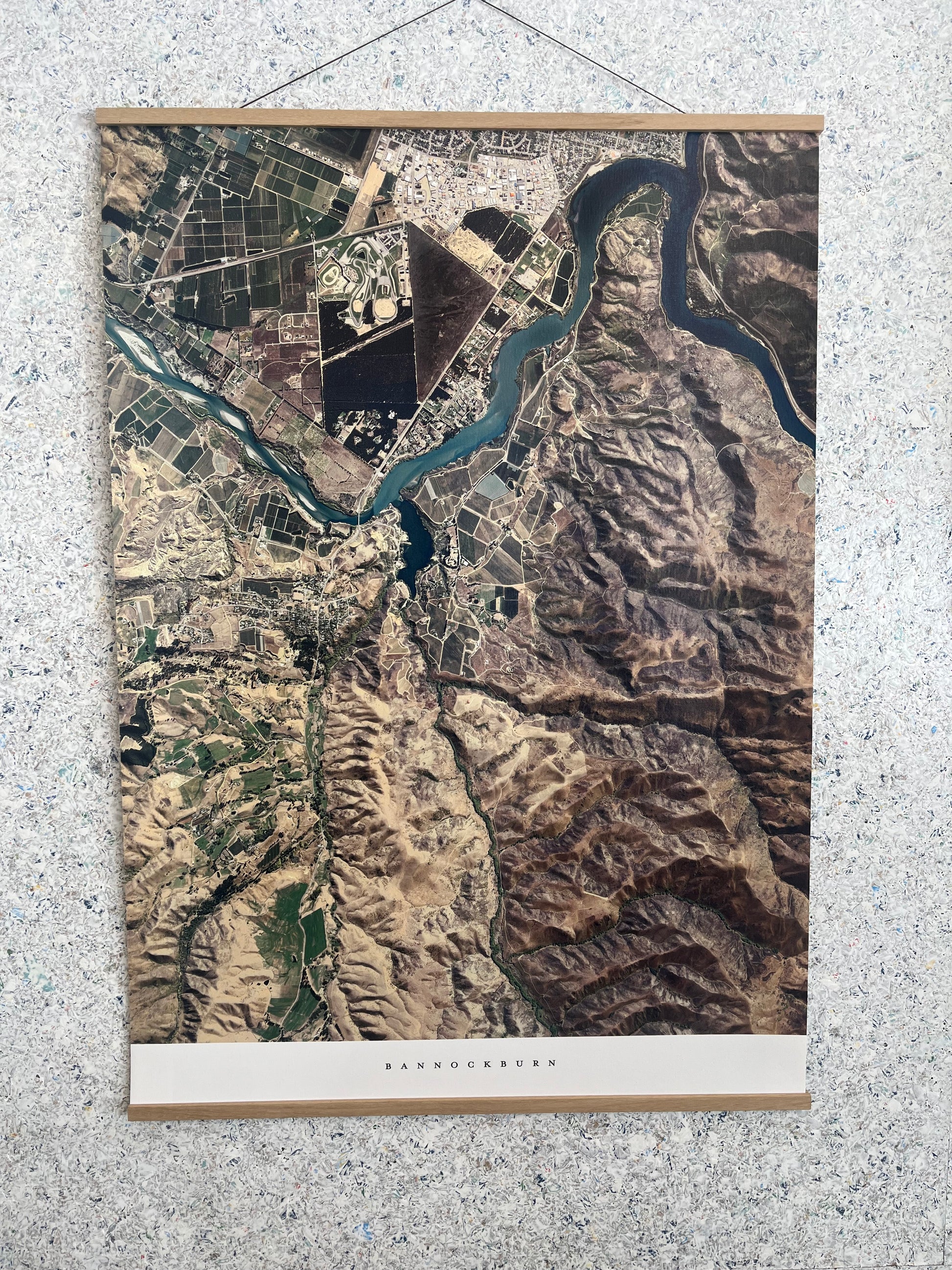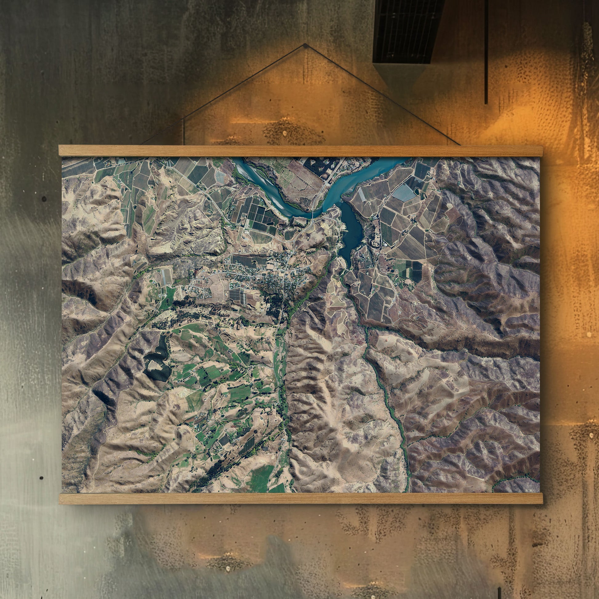 Framed by rugged hills and the shimmering waters of Lake Dunstan, Bannockburn is a Central Otago gem steeped in history and natural beauty. From the air, the patchwork of vineyards and golden landscapes tells the story of a place shaped by both pioneering spirit and the land itself. This aerial artwork captures Bannockburn’s quiet elegance, a timeless tribute to one of New Zealand’s most distinctive wine regions.